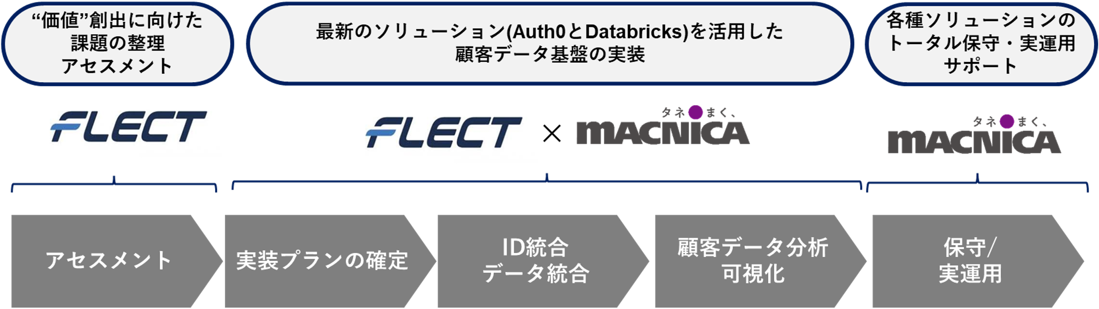 フレクトがマクニカと共に、周辺システムの連携含め、Auth0及びDatabricksの製品を組み込んだ顧客データ基盤を実装します。